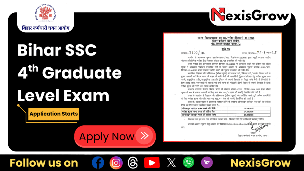 The Bihar Staff Selection Commission (BSSC) has released the notification for the 4th Graduate Level Combined Competitive Exam 2025. A total of 1481 vacancies are available for posts such as Assistant Section Officer, Auditor, Planning Assistant, and others. Candidates with a graduation degree are eligible to apply online from 25 August to 24 September 2025. Read all important details below.