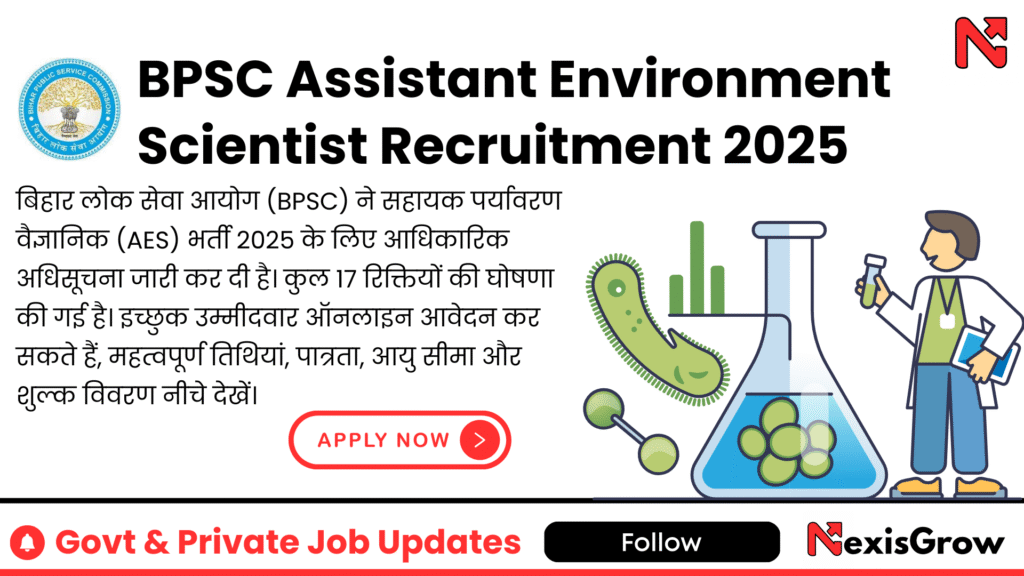 Bihar Public Service Commission (BPSC) has released the official notification for Assistant Environmental Scientist (AES) Recruitment 2025. A total of 17 vacancies are announced. Interested candidates can apply online, check important dates, eligibility, age limit, and fee details below.