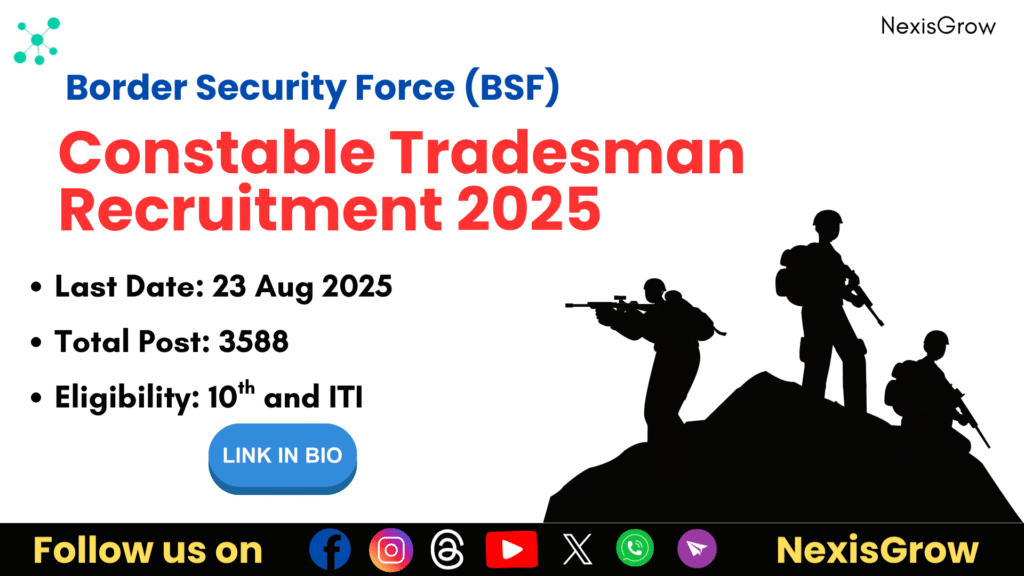 The Border Security Force (BSF) has released a recruitment notification for 3588 Constable (Tradesman) vacancies for both male and female candidates. Online applications are invited from 25 July to 23 August 2025. Candidates who have passed Class 10 and hold an ITI certificate in the relevant trade are eligible. Check all important dates, eligibility, fees, physical standards, and direct apply links below.