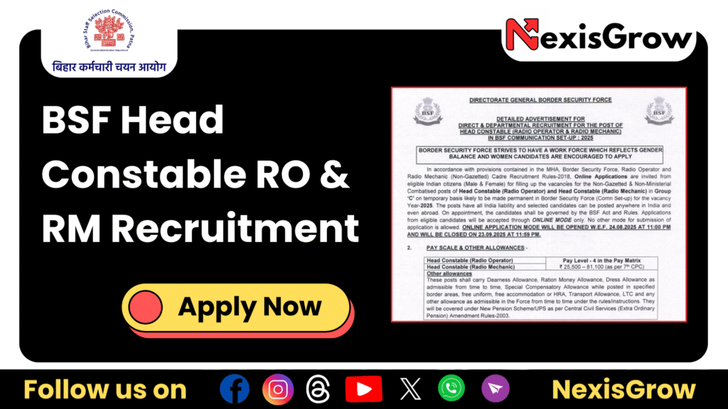 Border Security Force (BSF) has released the notification for Head Constable Recruitment 2025 with a total of 1121 vacancies including Radio Operator and Radio Mechanic posts. Candidates can apply online from 24th August 2025 to 23rd September 2025. Check important details below.