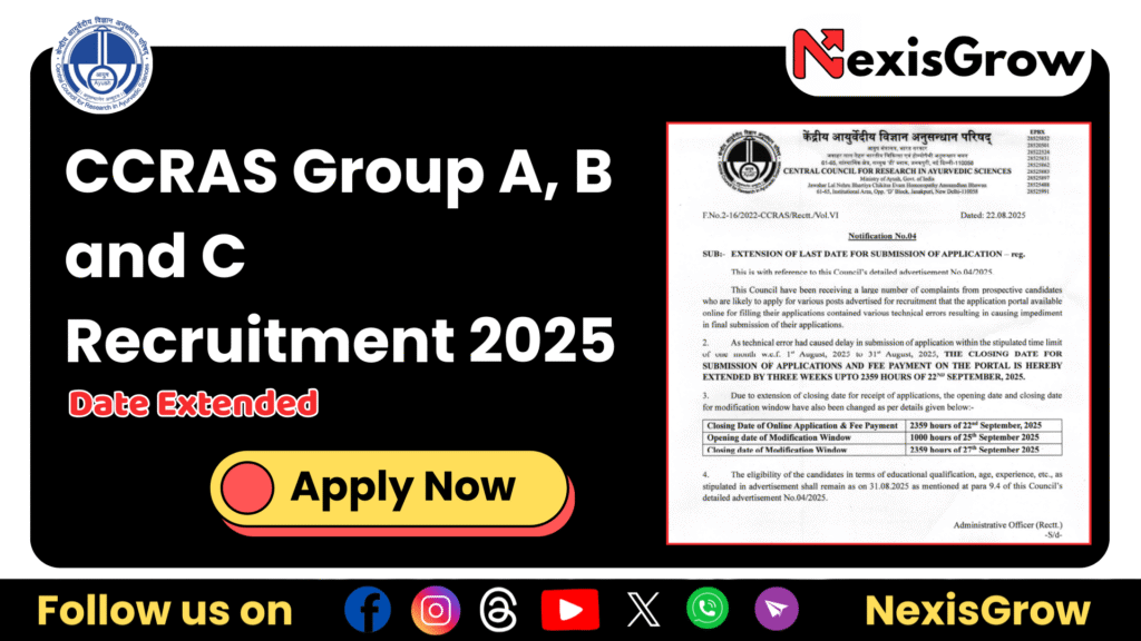 CCRAS Recruitment 2025 – Apply Online for Group A, B & C Various Posts (429 Vacancies)