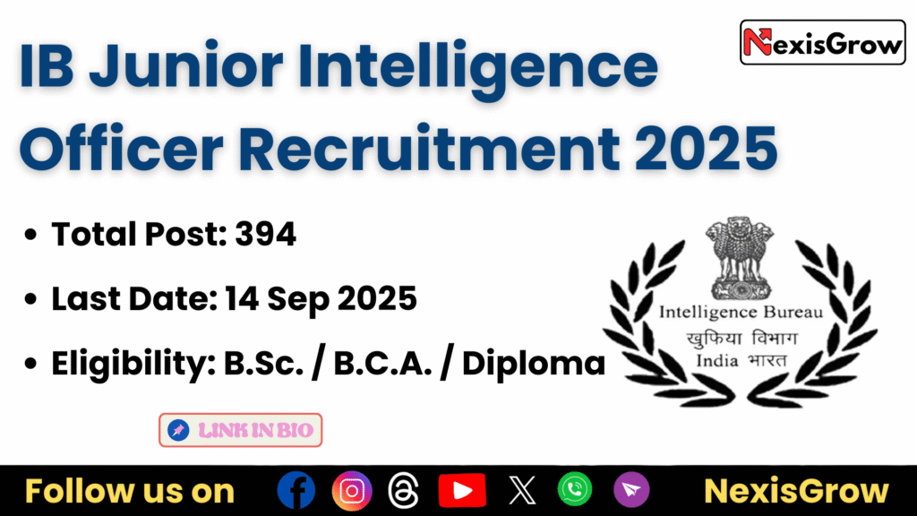 Ministry of Home Affairs (MHA), Intelligence Bureau (IB) has released the notification for Junior Intelligence Officer Grade–II/Tech (JIO-II/Tech) Examination 2025. A total of 394 vacancies are announced. Interested candidates can check eligibility, important dates, application fee, and exam pattern below.