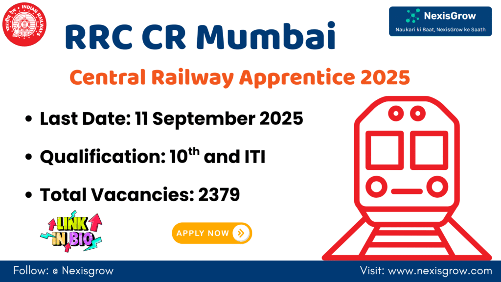 Railway Recruitment Cell Central Railway (RRC CR) has announced the Apprentice Recruitment 2025 for 2379 posts in various units/clusters. Candidates who have passed Class 10 with minimum 50% marks and hold an ITI certificate in the relevant trade can apply online between 12 August 2025 to 11 September 2025. Check eligibility, important dates, and application process below.