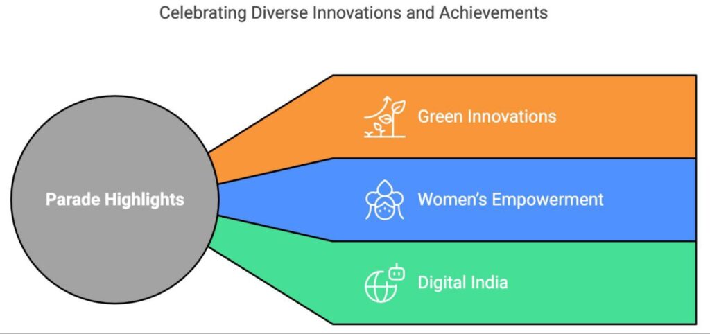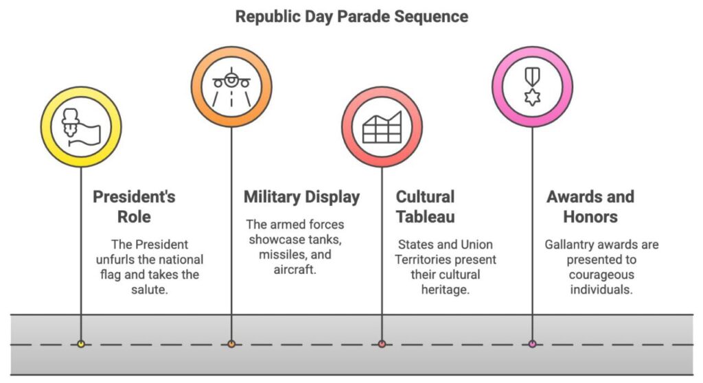 Republic Day is celebrated with grandeur and enthusiasm across India. The highlight of the celebrations is the grand parade held at Kartavya Path (formerly Rajpath) in New Delhi. This parade showcases India’s cultural diversity, military prowess, and technological advancements.