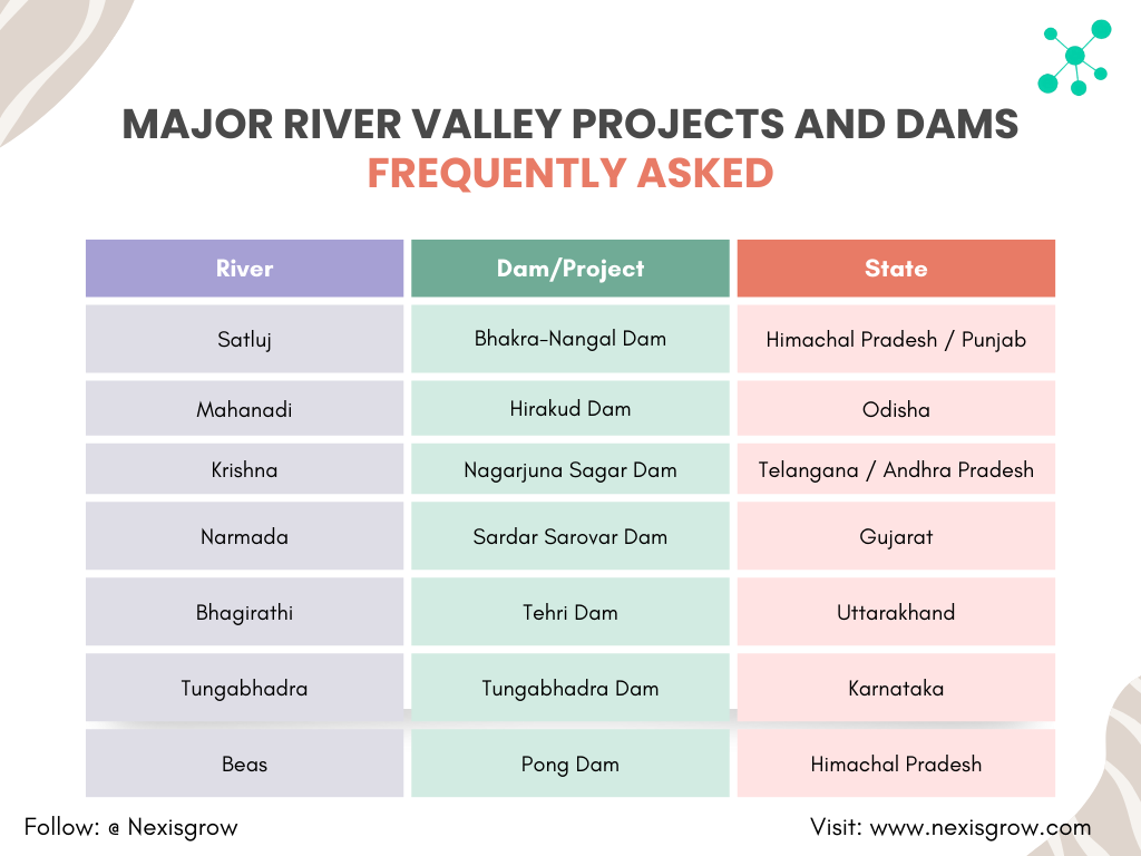 🏗️ 4. Major River Valley Projects and Dams (Frequently Asked)