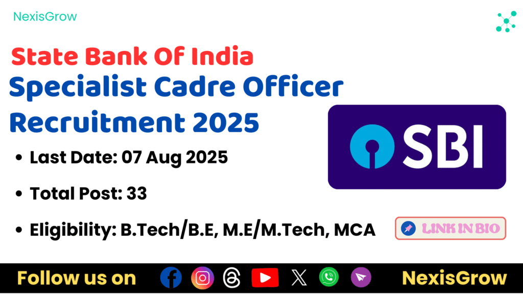 The State Bank of India (SBI) has released the Specialist Cadre Officer Recruitment 2025 notification for various audit-related positions including General Manager (GM), Assistant Vice President (AVP), and Deputy Manager (DM). A total of 33 posts are available under this drive. Candidates holding B.E/B.Tech, M.E/M.Tech, or MCA qualifications can apply online from 11 July to 7 August 2025. Salary packages go up to ₹1 crore CTC annually. Check eligibility, salary, application fee, and direct links below.