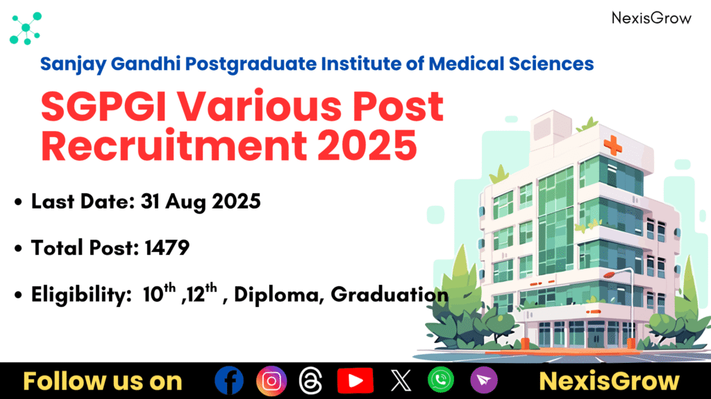 Sanjay Gandhi Post Graduate Institute of Medical Sciences (SGPGI), Lucknow has released the official notification for the recruitment of Nursing Officers and various Non-Teaching posts. A total of 1479 vacancies have been announced. Interested and eligible candidates can apply online from 18 June to 31 July 2025. Check important dates, eligibility, fees, and post-wise details below.