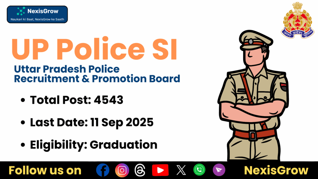 The Uttar Pradesh Police Recruitment and Promotion Board (UPPRPB) has announced the UP Police Sub Inspector (SI) Recruitment 2025 for 4543 posts including Sub Inspector Civil Police, Platoon Commander PAC, Platoon Commander Special Force, and Sub Inspector Female Battalion. Candidates can apply online from 12 August 2025 to 11 September 2025. Below are the complete details including eligibility, application process, and important dates.